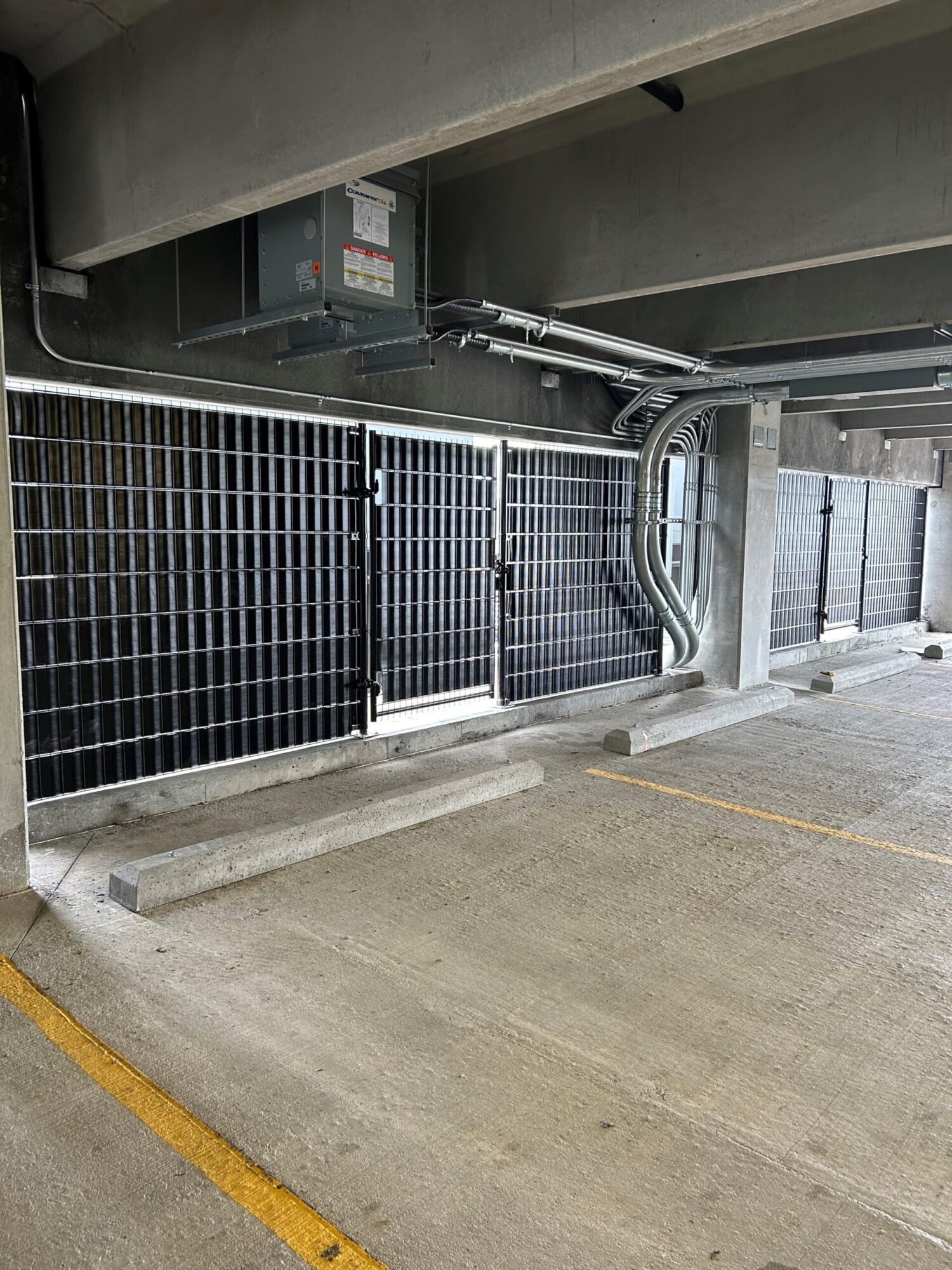 In addition, because security had been an issue, we built enclosures inside and outside the parkade with durable, breach resistant Rampart 284 welded wire panels with privacy inserts to not only protect, but conceal what’s behind the fence. Â